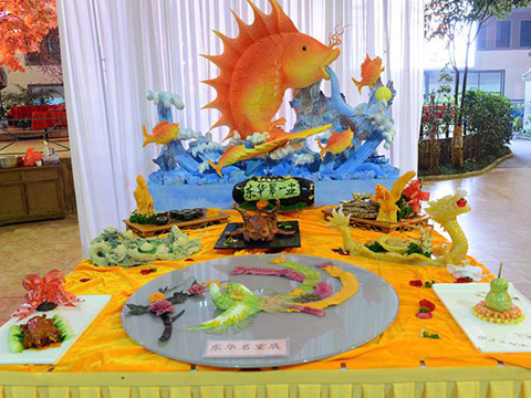 來自全市知名酒店的廚師們使出了渾身解數(shù),做出了一道道色、香、味俱佳的菜品,最惹眼的還是選手們憑著精湛的食雕技藝雕出的栩栩如的龍鳳花鳥,讓人駐足欣賞仔細(xì)端詳,贊嘆不已。經(jīng)過激烈的烹飪作品評比、烹飪知識問答、才藝展示及論文評比,最終評比淮南十佳名廚和三位優(yōu)秀廚師。東華怡樂生態(tài)園參賽選手分別獲得優(yōu)秀廚師一名,淮南市優(yōu)秀名廚一名。